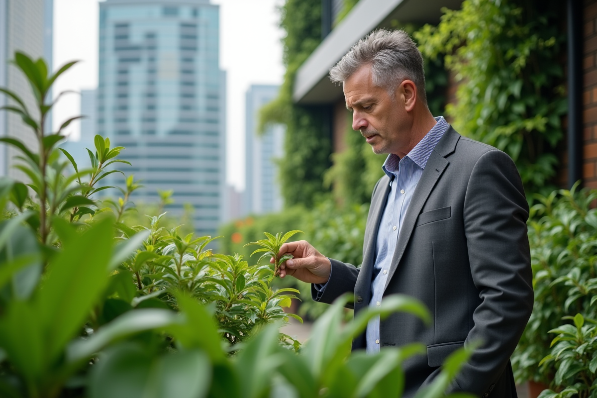 Homme d'âge moyen dans un jardin urbain sur un toit